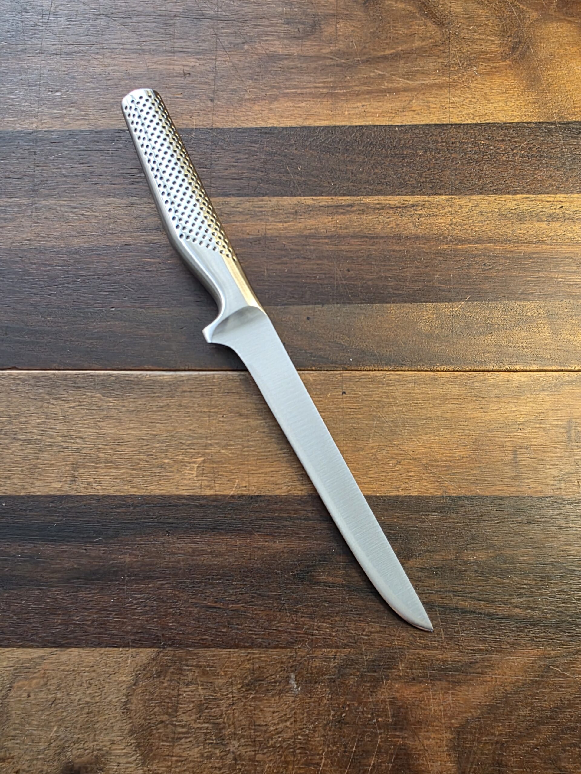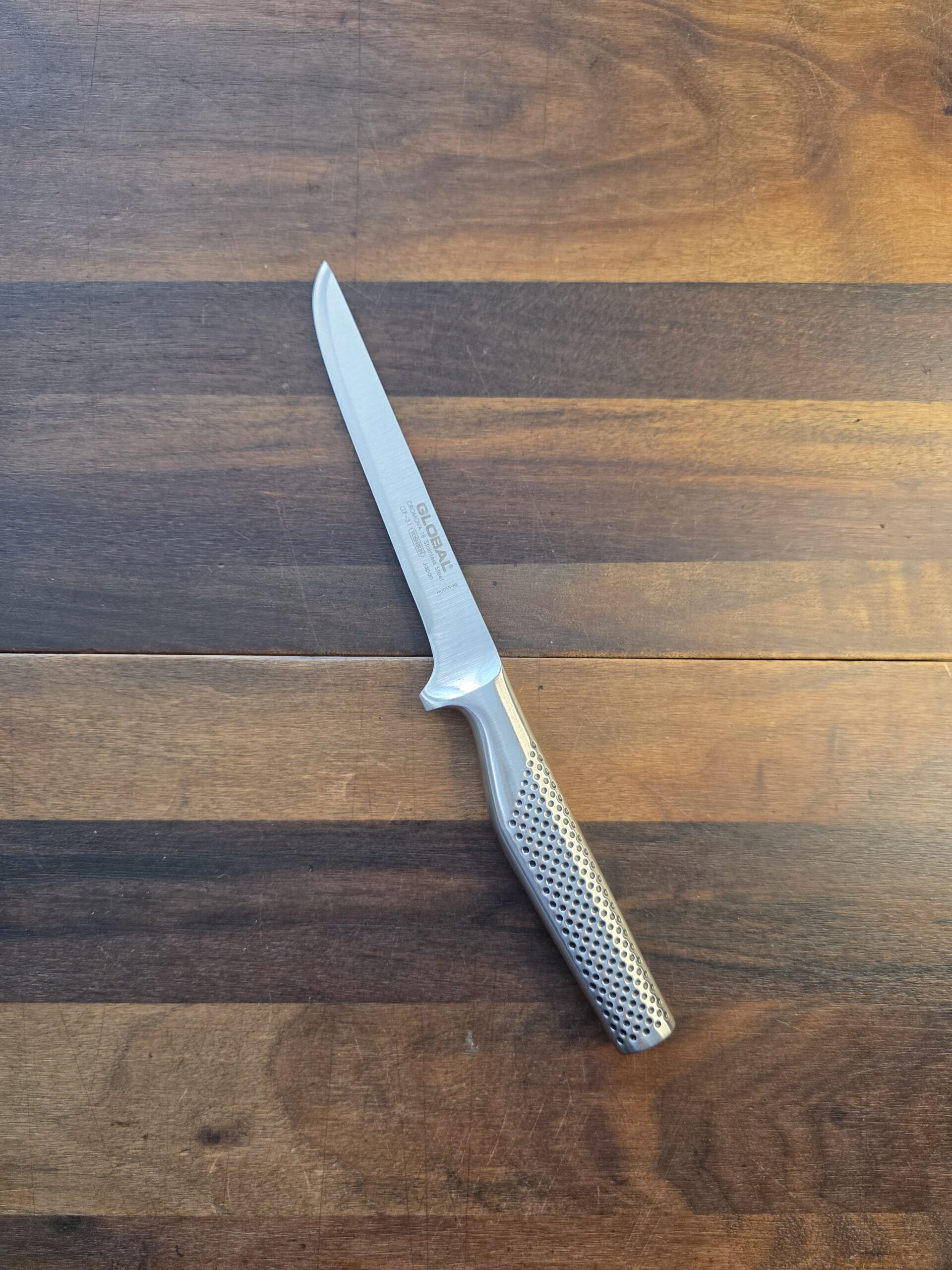 Il GF-31 è essenzialmente la versione completamente forgiata dei coltelli da disosso di Global. Il coltello ha lama lunga e sottile che lo rende adatto a penetrare tra la pelle e la carne del pesce.