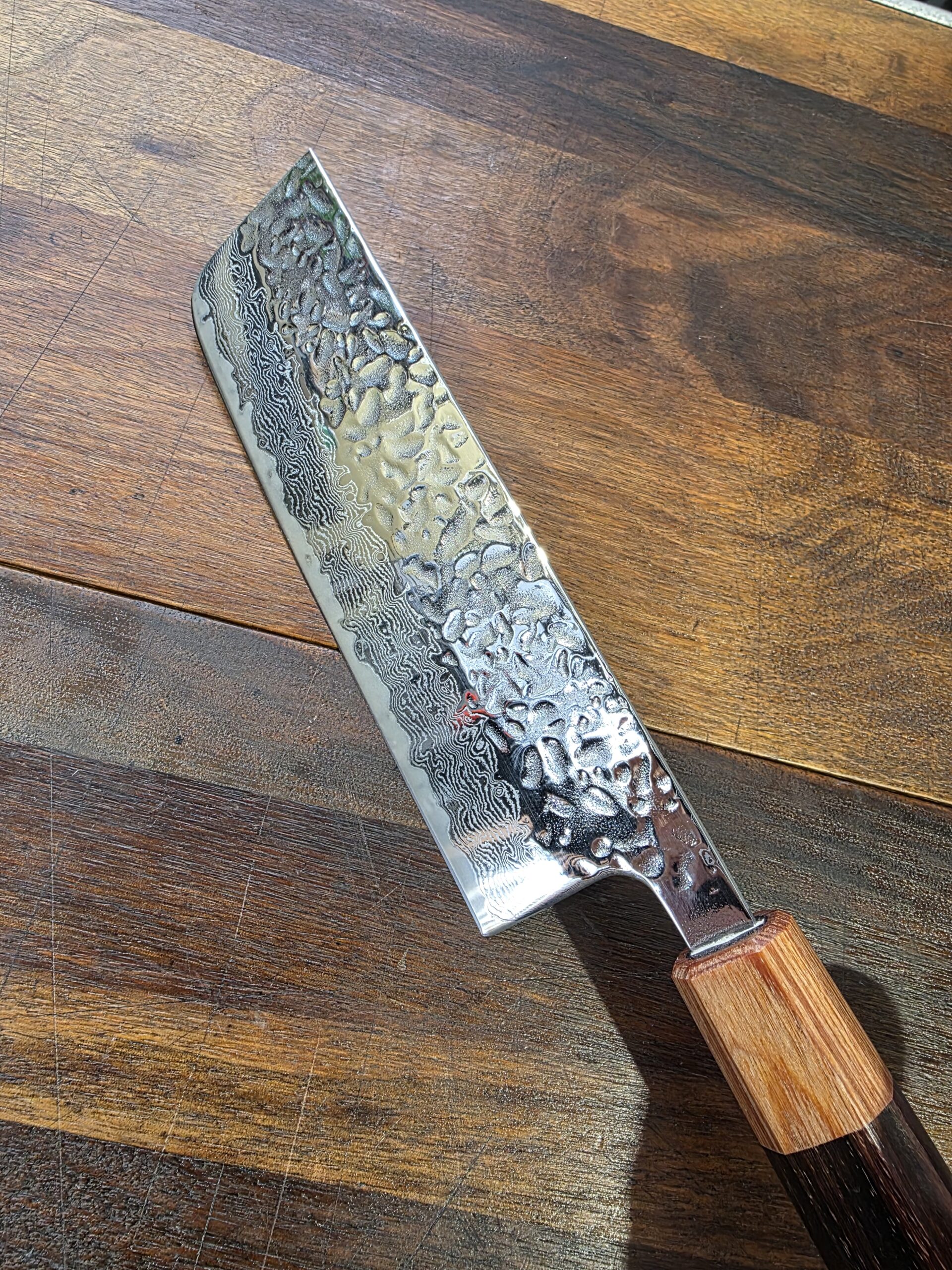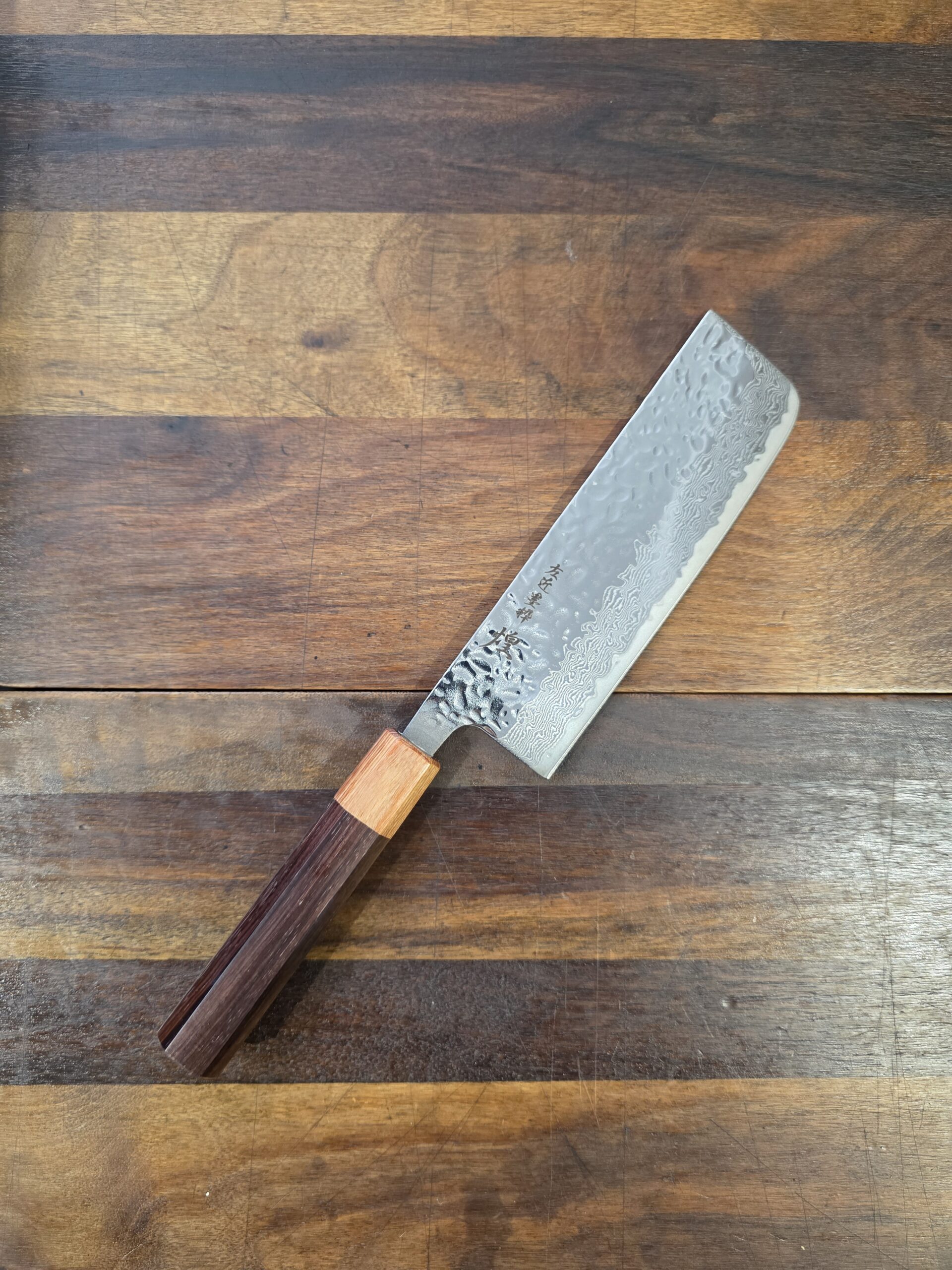 La lama è realizzata in SAN-MAI con 2 guance esterne in vero acciaio damasco lucidato a specchio E FINITURA MARTELLATA (Tsuchime) e un nucleo centrale in acciaio ad alto tenore di carbonio AUS10 (inox) di origine Giapponese. La durezza della lama dopo la tempra rimane a 60° HRC .